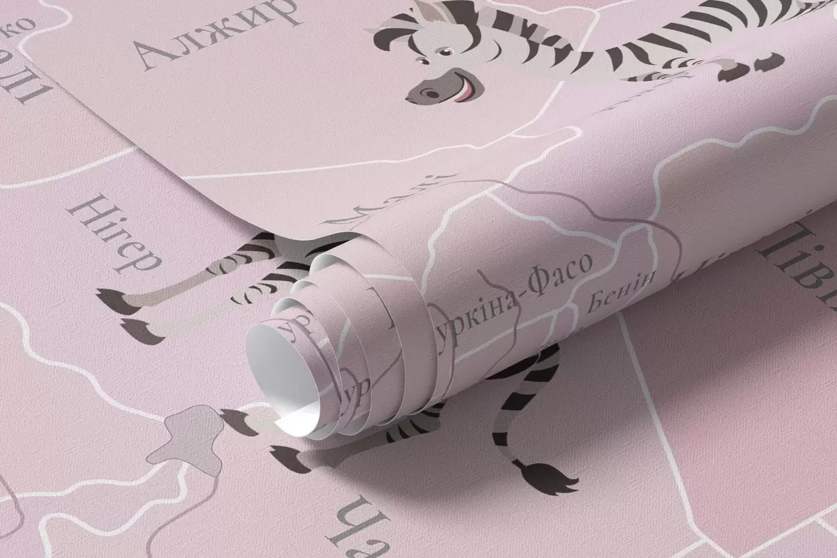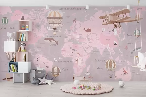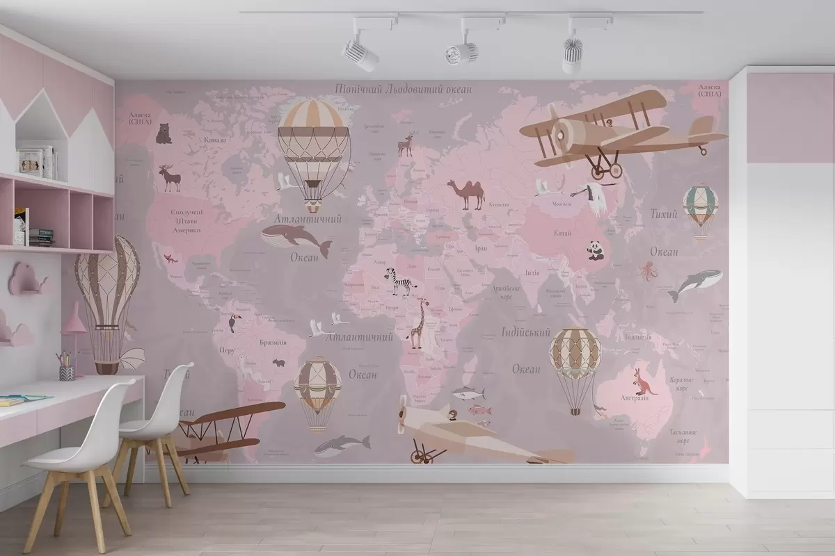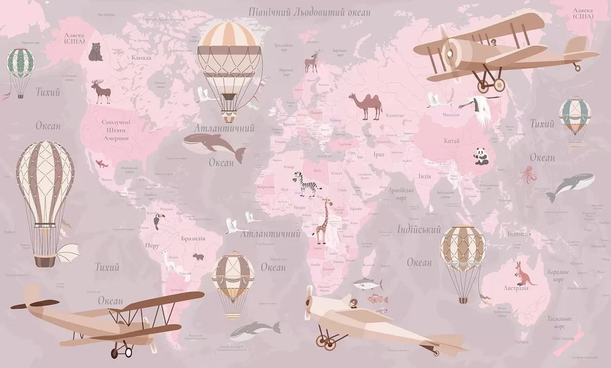 Valokuvatapetti Lasten maailmankartta, jossa on eläimiä, lentokoneita ja kuumailmapalloja. Ukrainan kieli. Vaaleanpunainen väri. Nr c00003ukv3