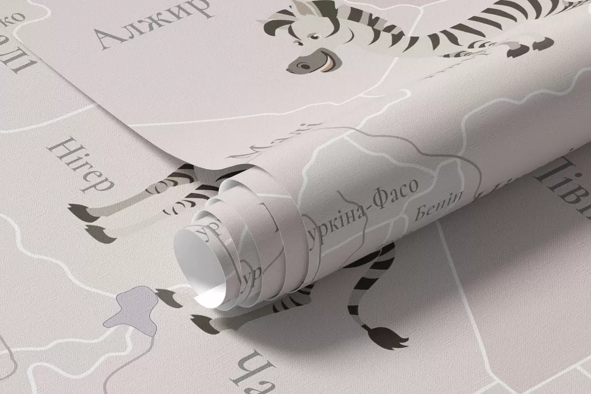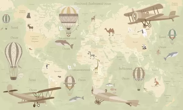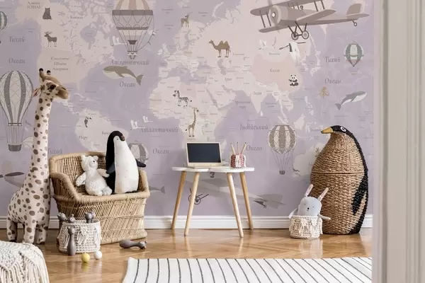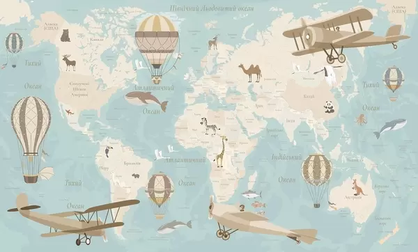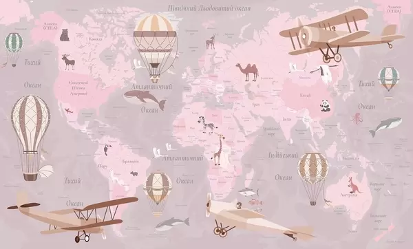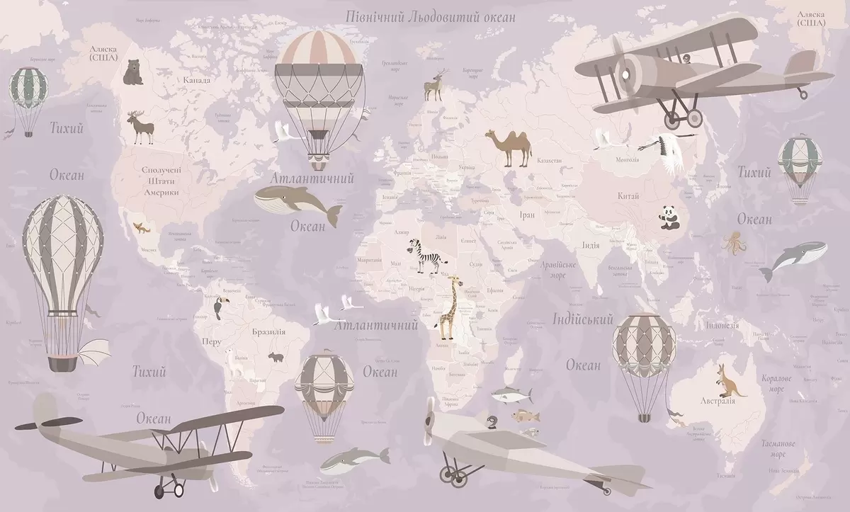 Valokuvatapetti Lasten maailmankartta, jossa on eläimiä, lentokoneita ja kuumailmapalloja. Ukrainan kieli. Violetti väri. Nr c00003ukv4