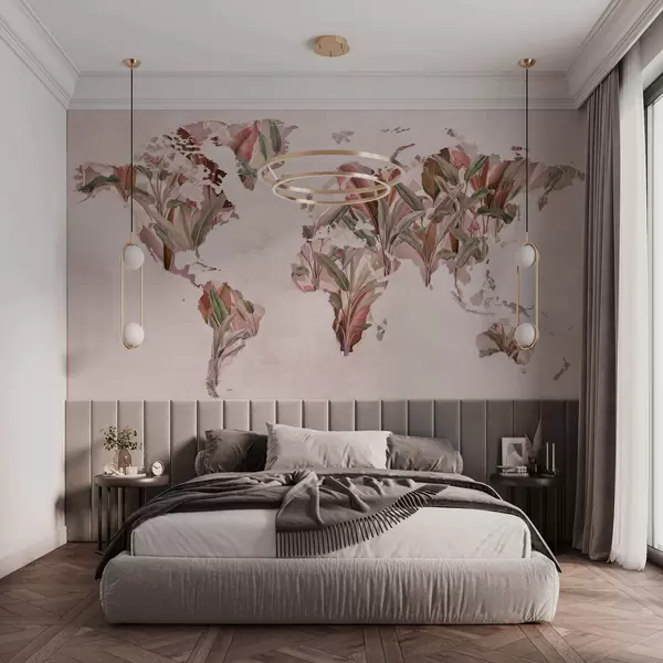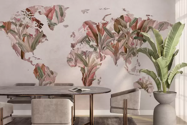 Valokuvatapetti Banaanilehdistä tehty vaaleanpunainen maailmankartta Nr c00007v2