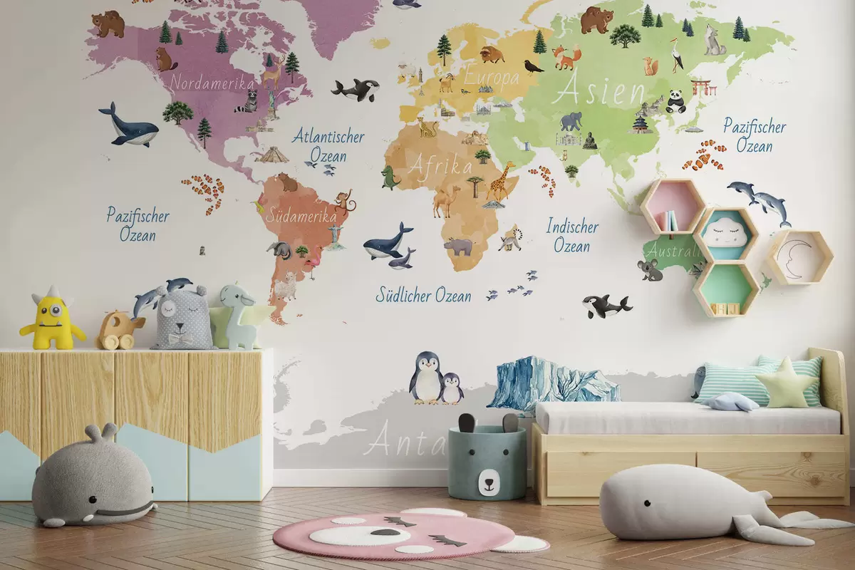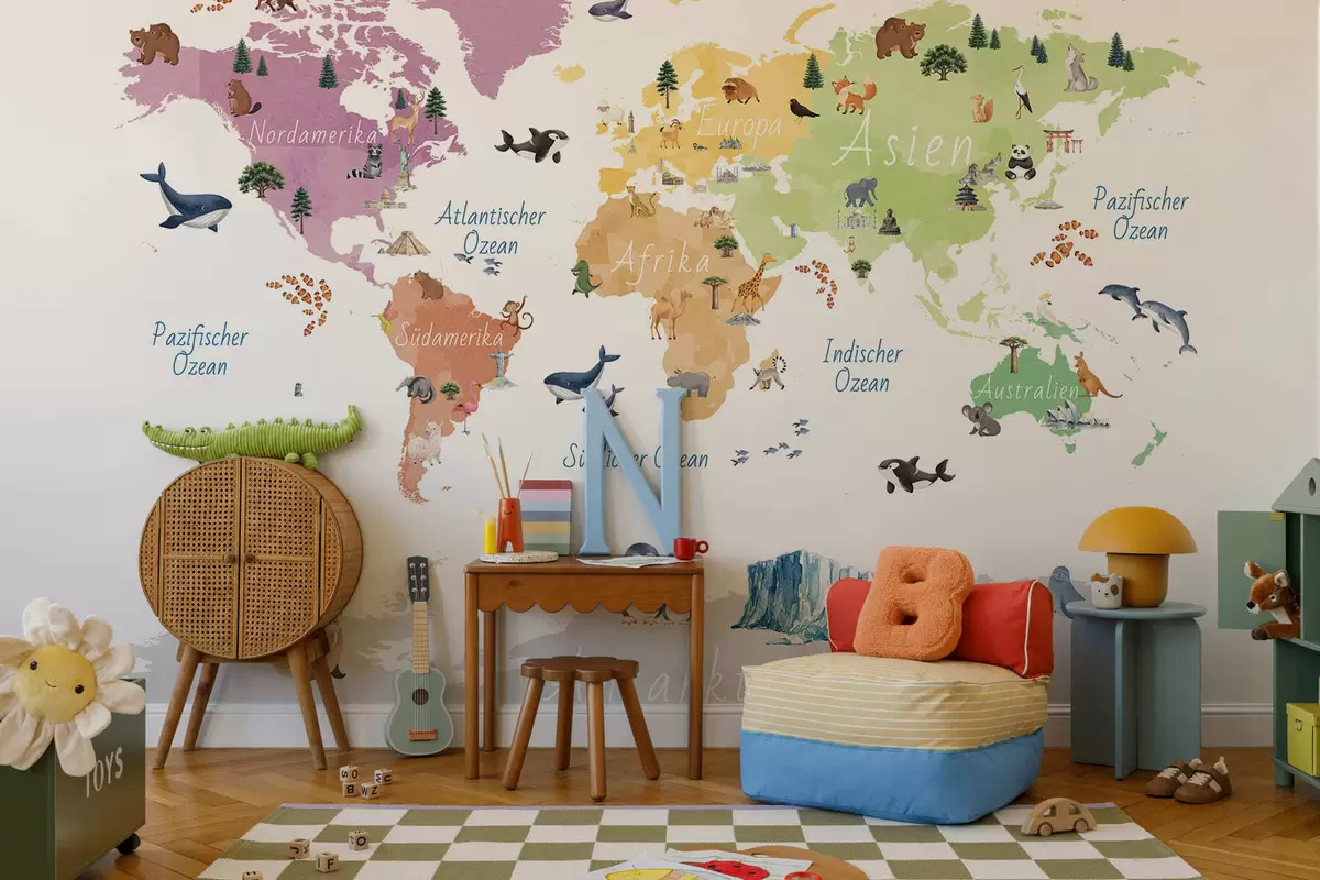 Valokuvatapetti Vesivärityylinen värikartta, jossa on eläimiä, kasveja ja arkkitehtuuria. Tekstit saksaksi Nr c00009de