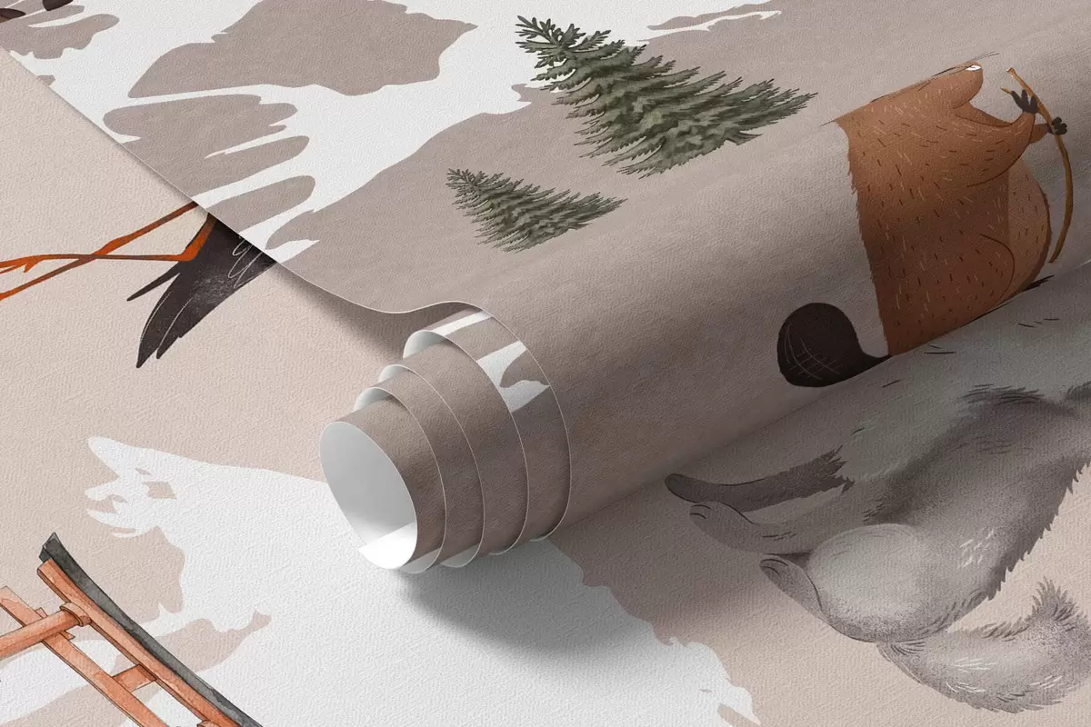 Valokuvatapetti Vesivärityylinen beige kartta, jossa on eläimiä, kasveja ja arkkitehtuuria. Tekstit englanniksi Nr c00009env3