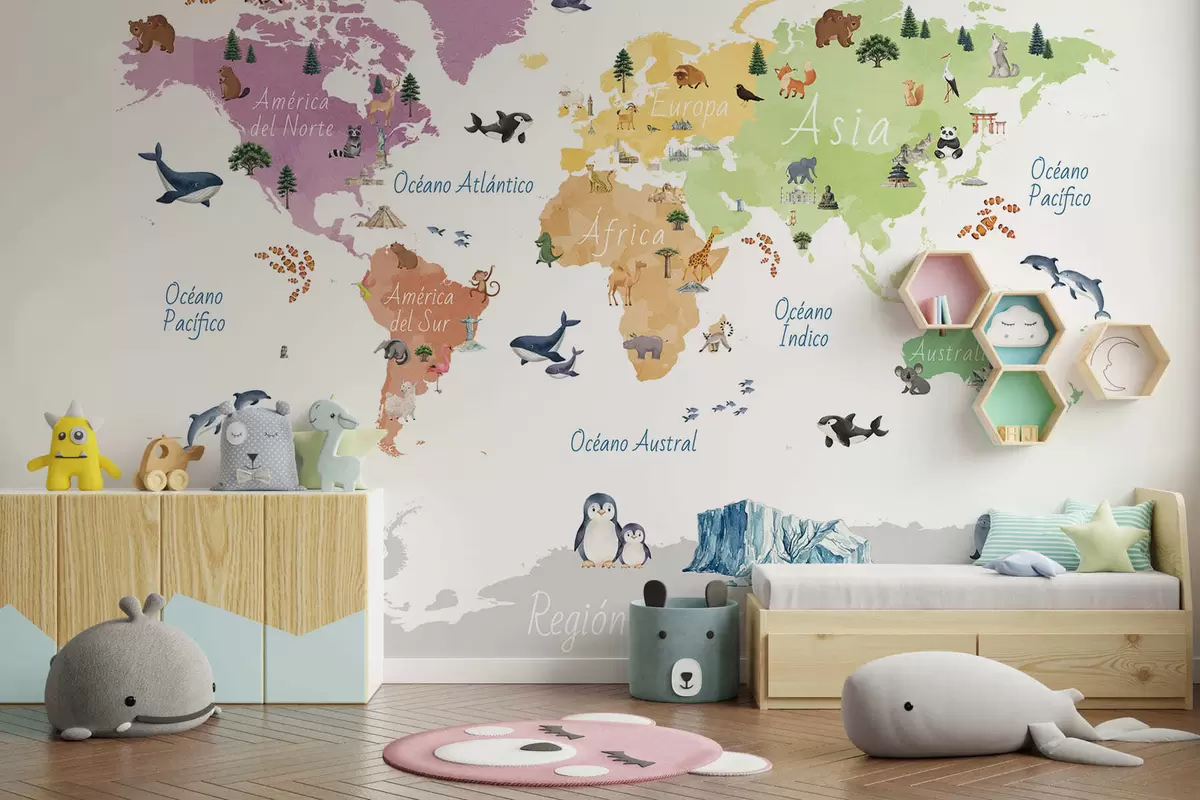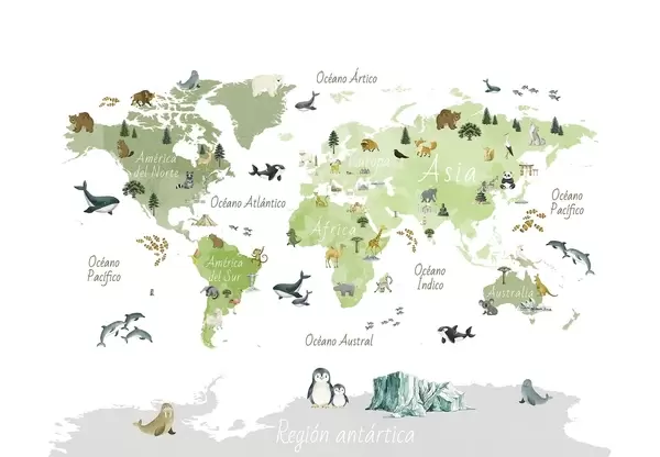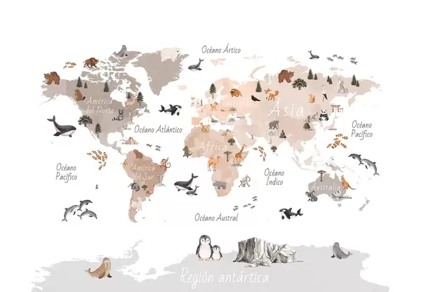 Valokuvatapetti Vesivärityylinen värikartta, jossa on eläimiä, kasveja ja arkkitehtuuria. Tekstit espanjaksi Nr c00009es