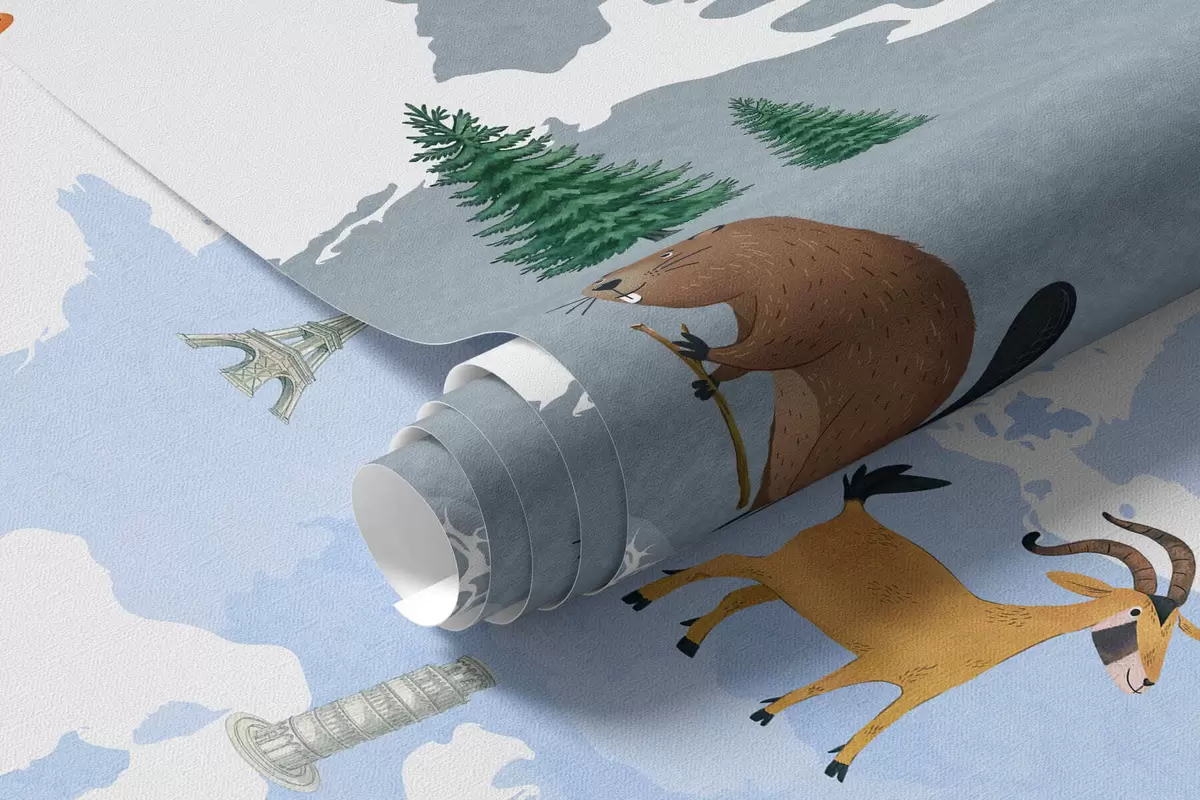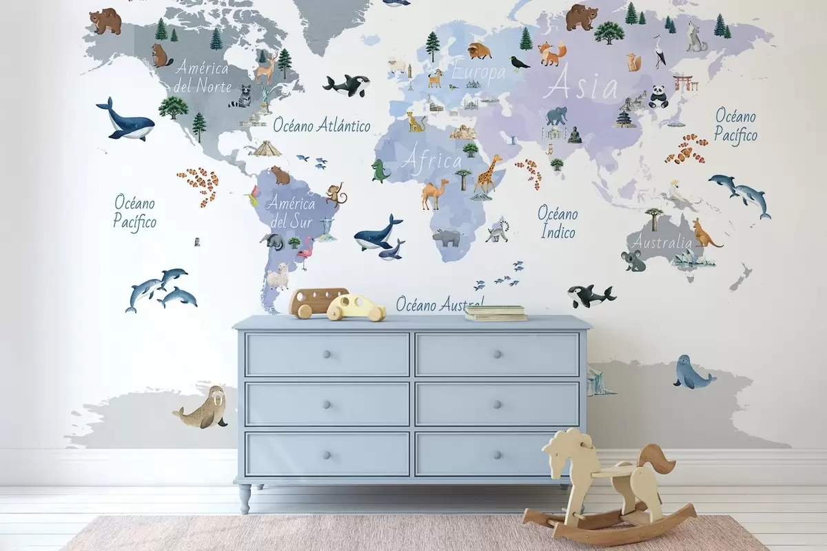 Valokuvatapetti Vesivärityylinen sininen kartta, jossa on eläimiä, kasveja ja arkkitehtuuria. Tekstit espanjaksi Nr c00009esv1