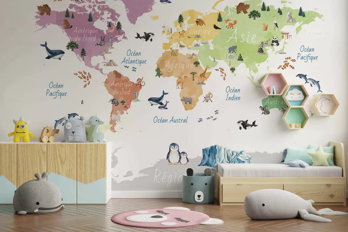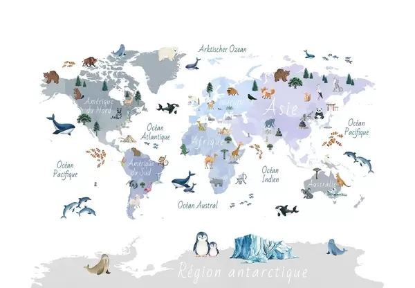 Valokuvatapetti Vesivärityylinen värikartta, jossa on eläimiä, kasveja ja arkkitehtuuria. Tekstit ranskaksi Nr c00009fr