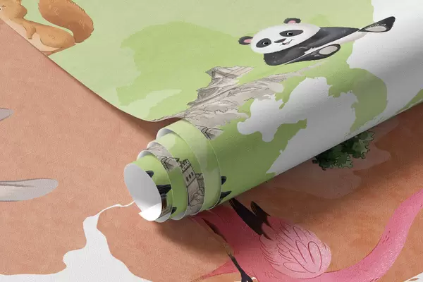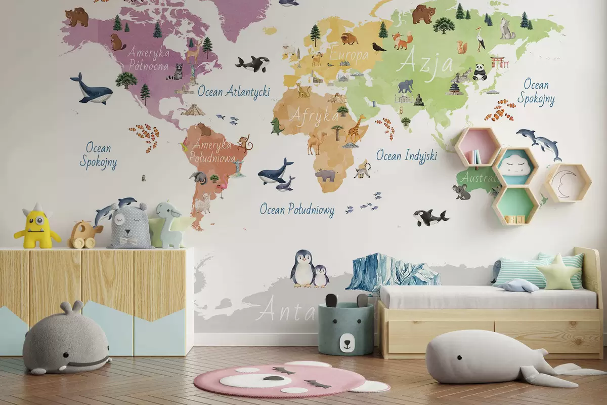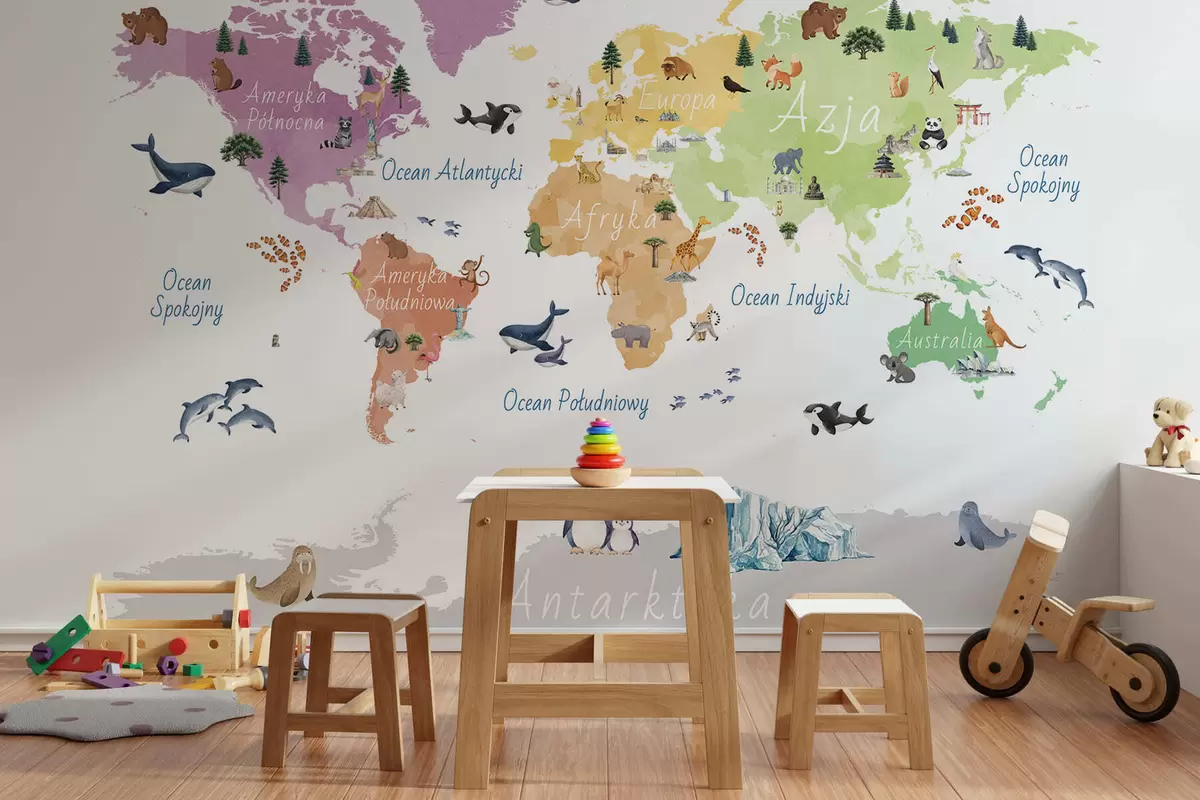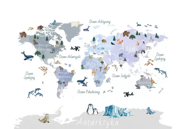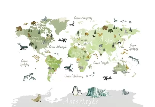 Valokuvatapetti Vesivärityylinen värikartta, jossa on eläimiä, kasveja ja arkkitehtuuria. Tekstit puolaksi Nr c00009pl