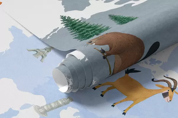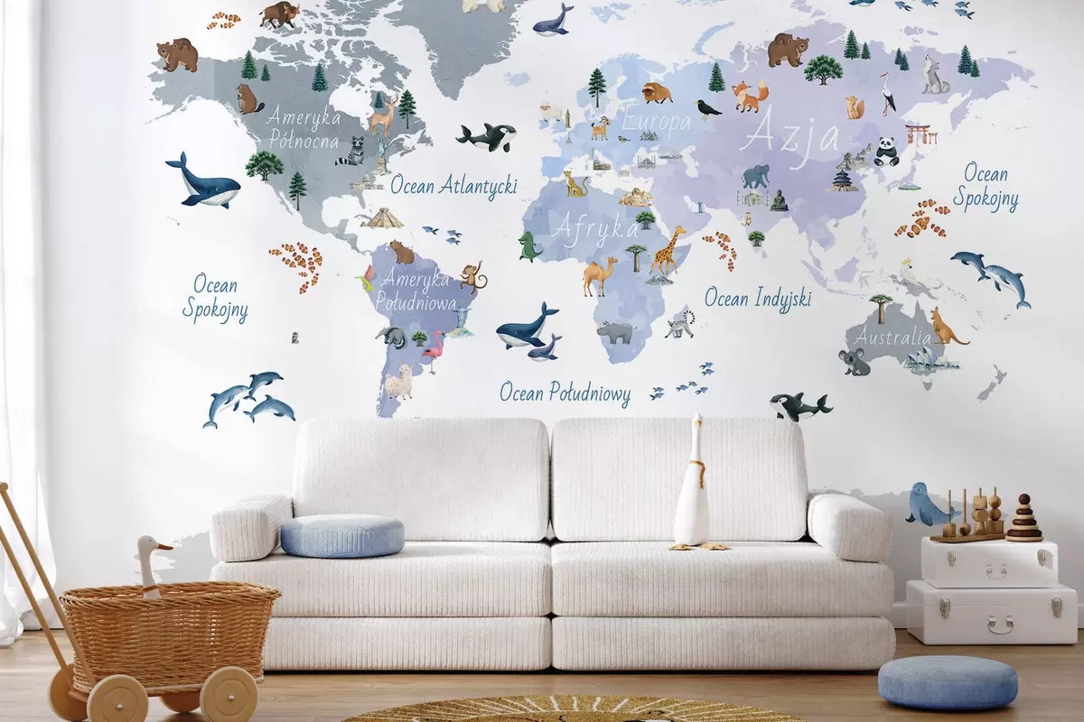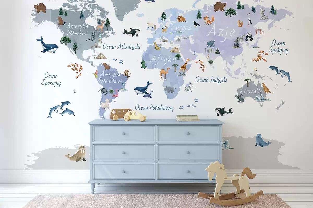 Valokuvatapetti Vesivärityylinen sininen kartta, jossa on eläimiä, kasveja ja arkkitehtuuria. Tekstit puolaksi Nr c00009plv1