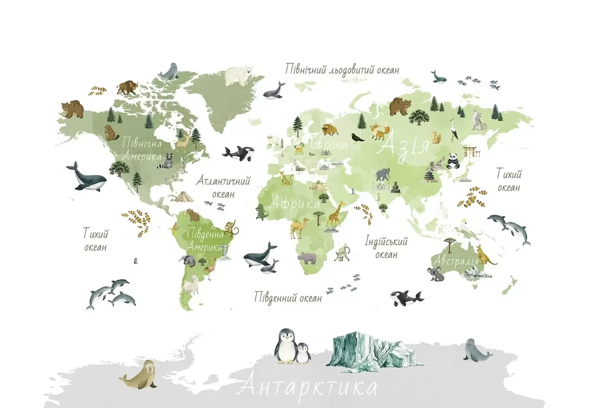 Valokuvatapetti Vesivärityylinen vihreä kartta, jossa on eläimiä, kasveja ja arkkitehtuuria. Tekstit ukrainaksi Nr c00009ukv2
