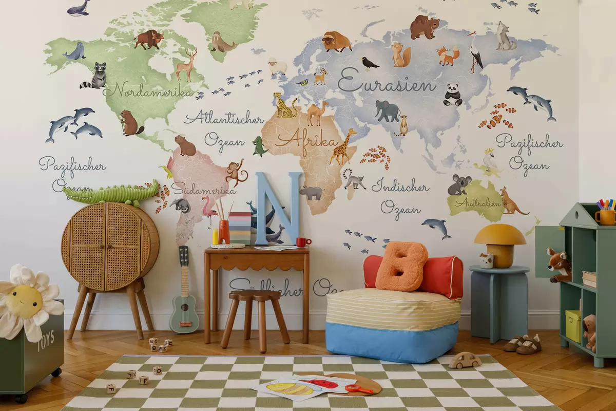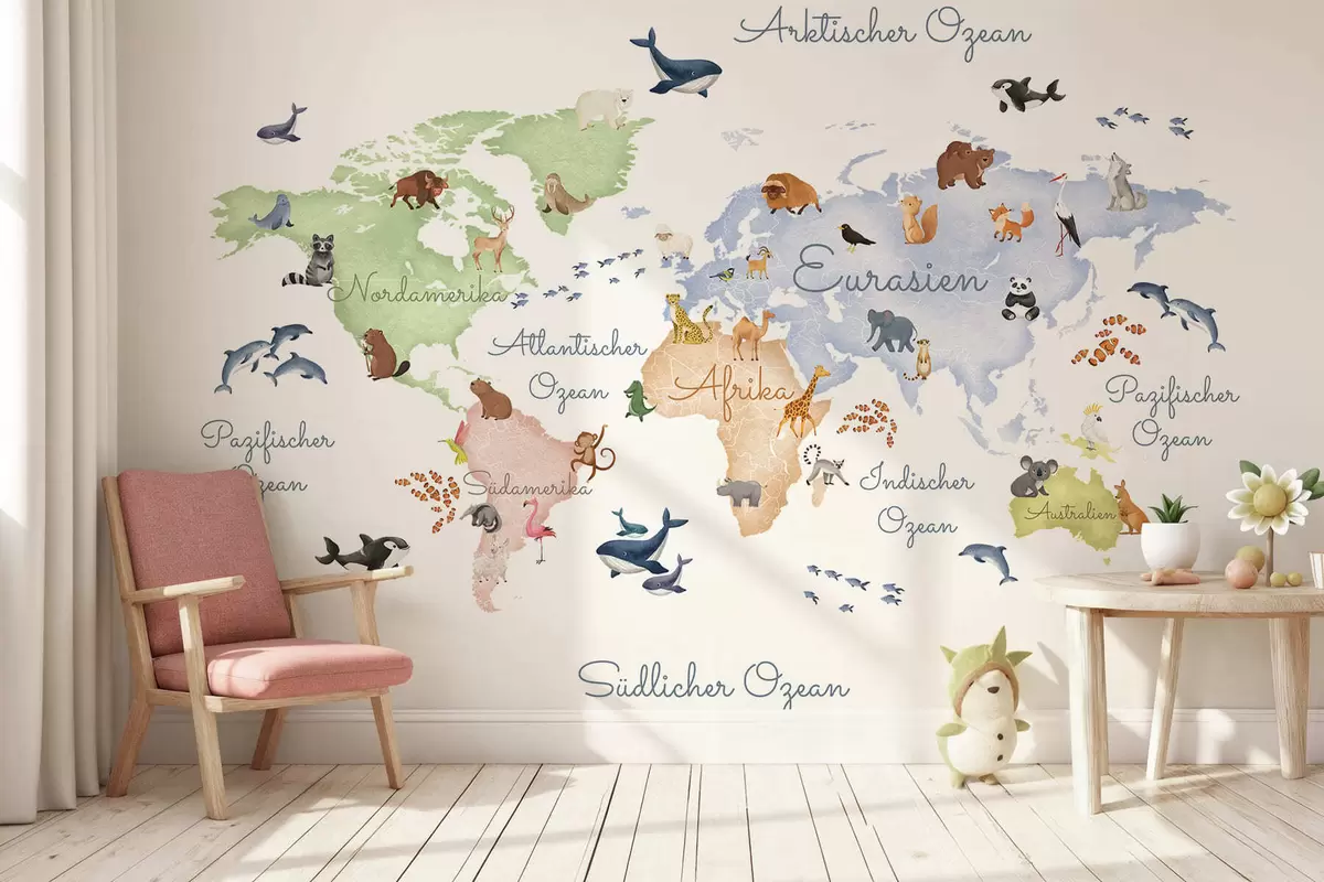 Valokuvatapetti Vesivärityylinen valkoinen kartta, jossa on eläimiä. Tekstit saksaksi Nr c00012de