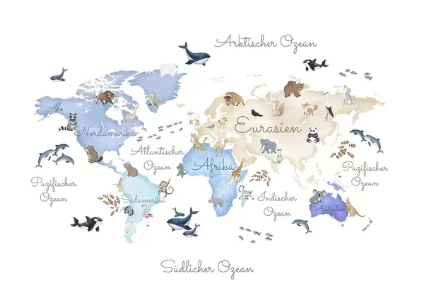 Valokuvatapetti Vesivärityylinen sininen kartta, jossa on eläimiä. Tekstit saksaksi Nr c00012dev1