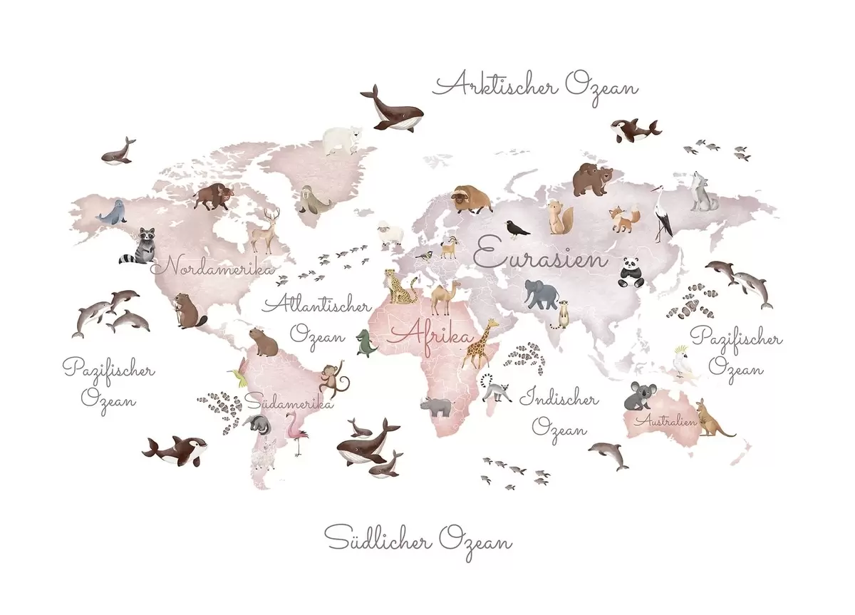 Valokuvatapetti Vesivärityylinen beige kartta, jossa on eläimiä. Paikannimet saksaksi Nr c00012dev3