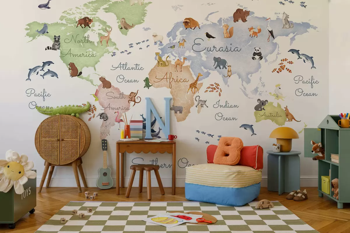 Valokuvatapetti Vesivärityylinen värikartta, jossa on eläimiä. Tekstit englanniksi Nr c00012en