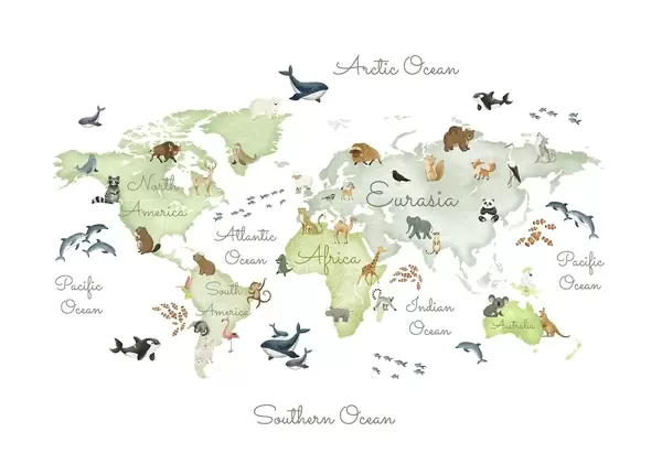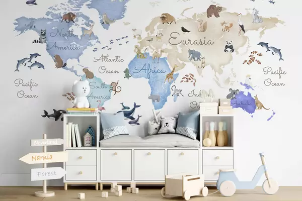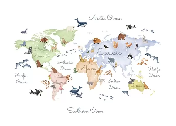Valokuvatapetti Vesivärityylinen sininen kartta, jossa on eläimiä. Tekstit englanniksi Nr c00012env1