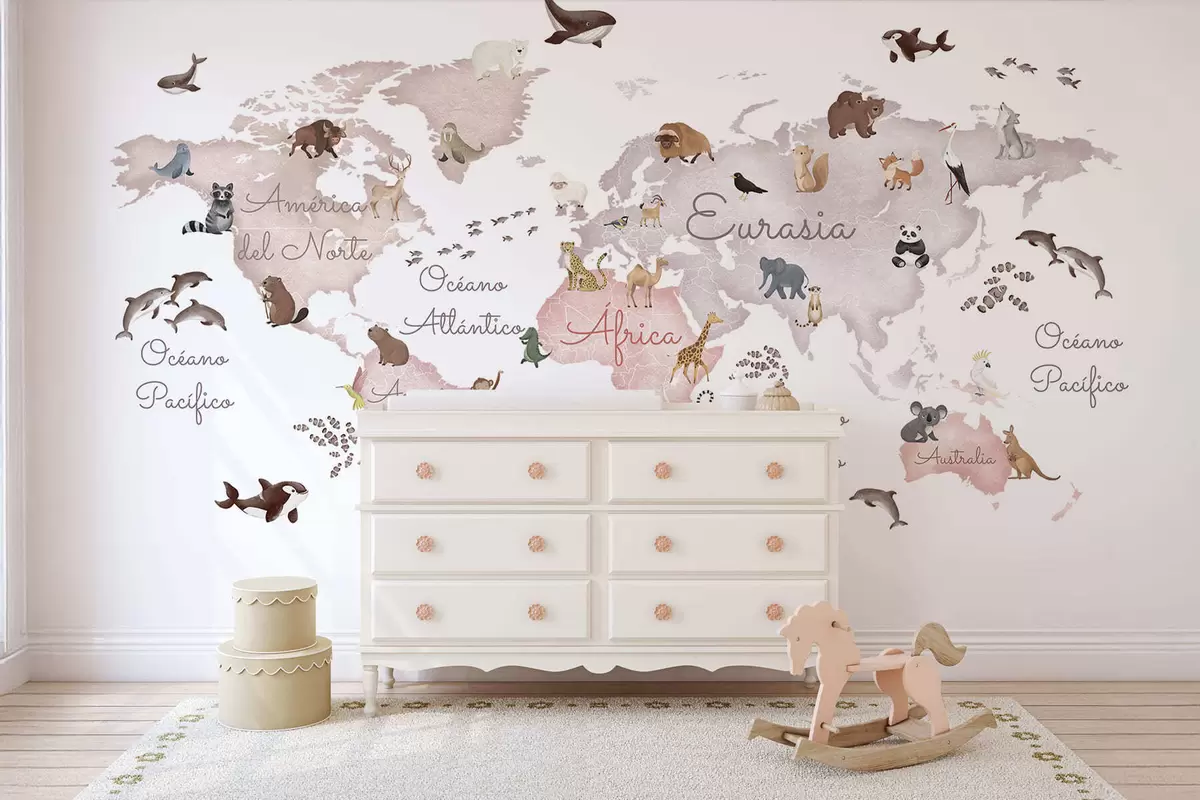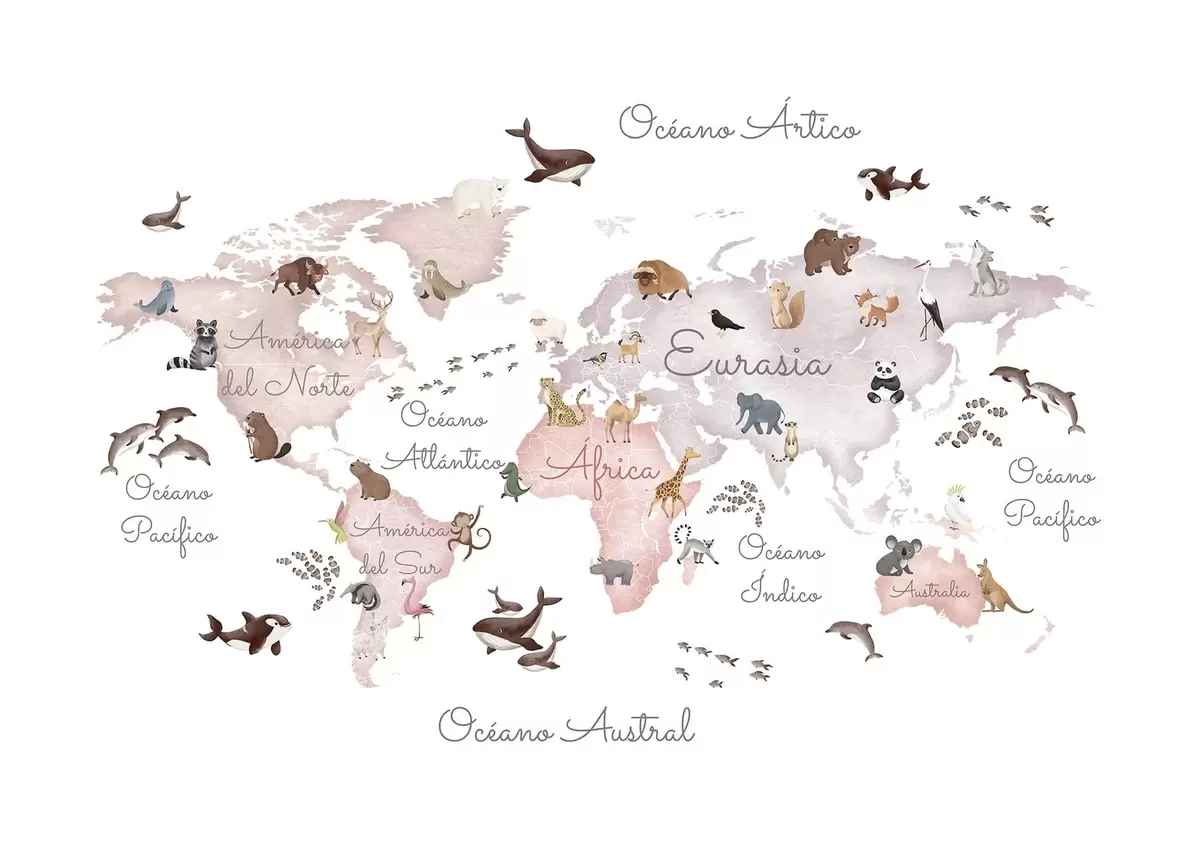 Valokuvatapetti Vesivärityylinen beige kartta, jossa on eläimiä. Tekstit espanjaksi Nr c00012esv3