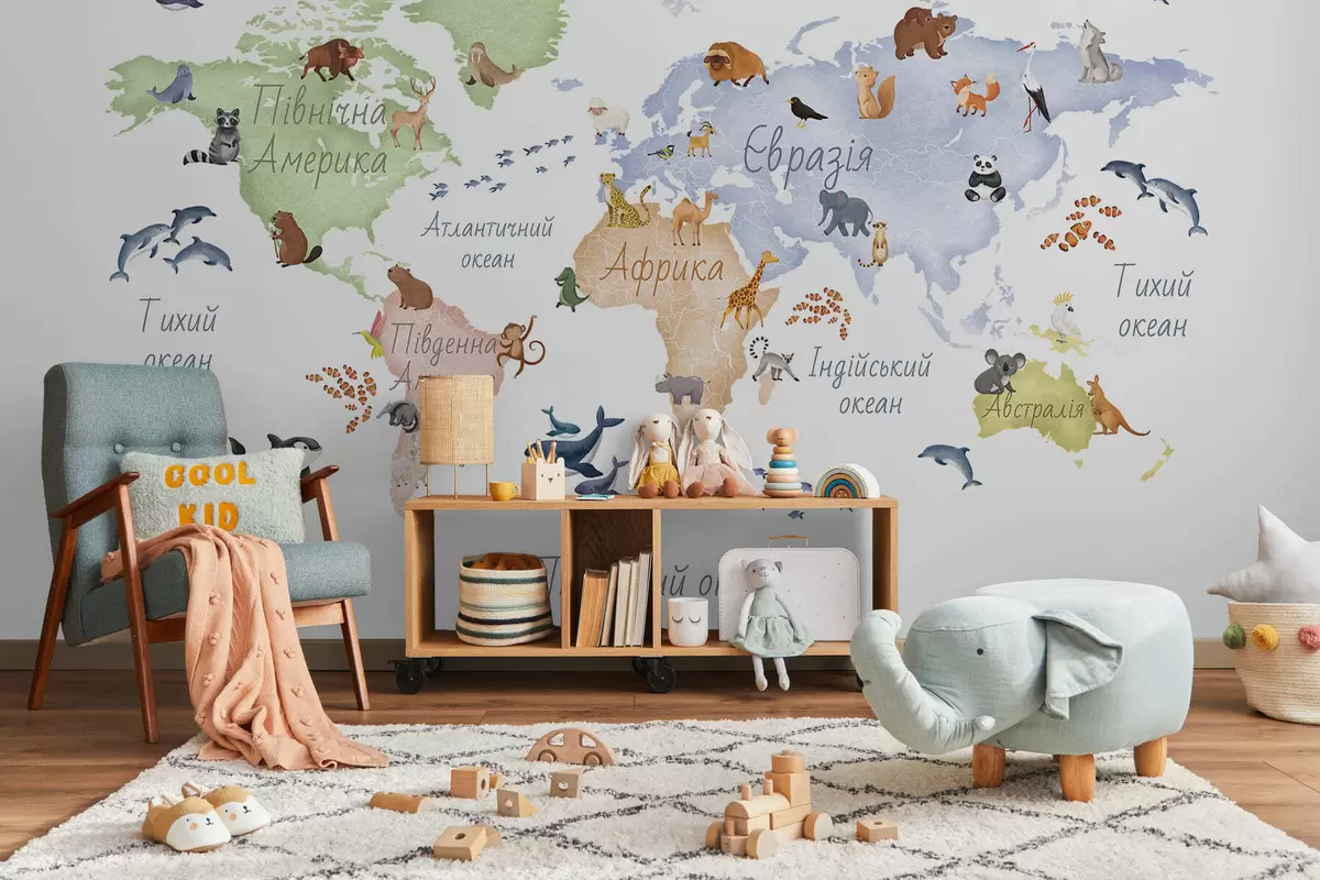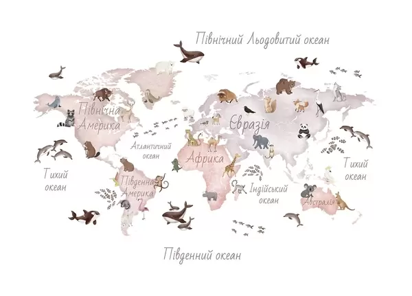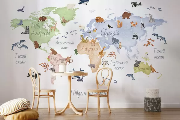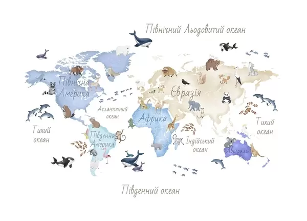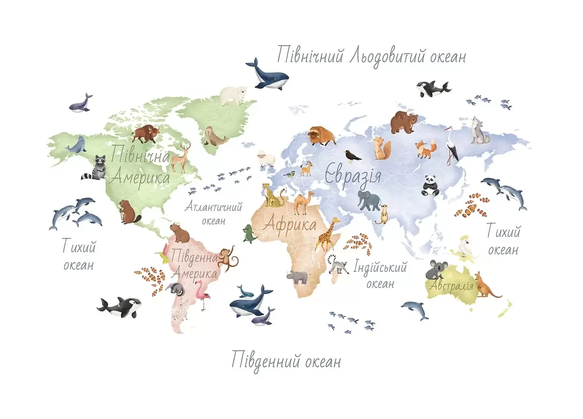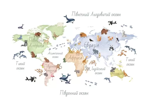 Valokuvatapetti Vesivärityylinen värikartta, jossa on eläimiä. Tekstit ukrainaksi Nr c00012uk