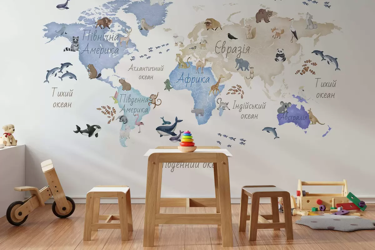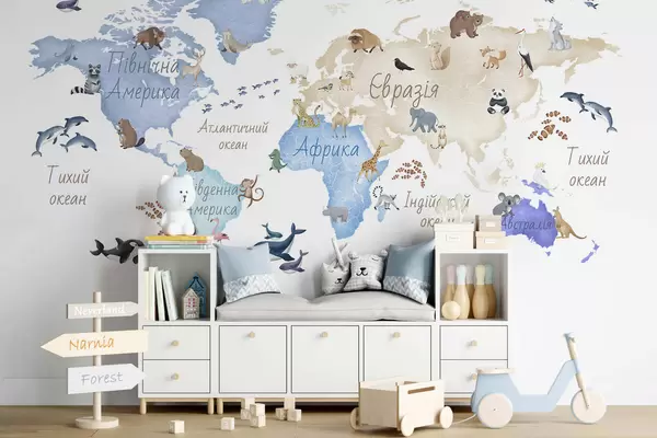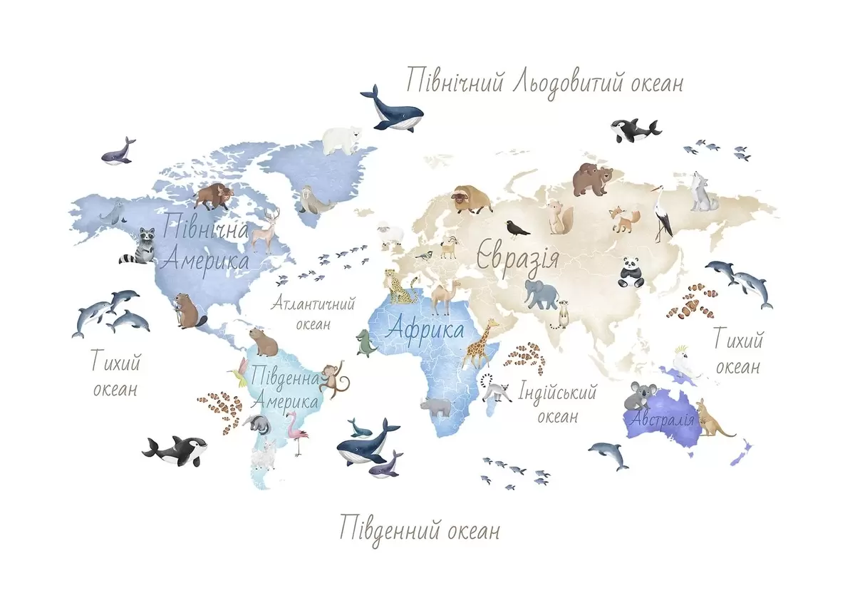 Valokuvatapetti Vesivärityylinen sininen kartta, jossa on eläimiä. Tekstit ukrainaksi Nr c00012ukv1