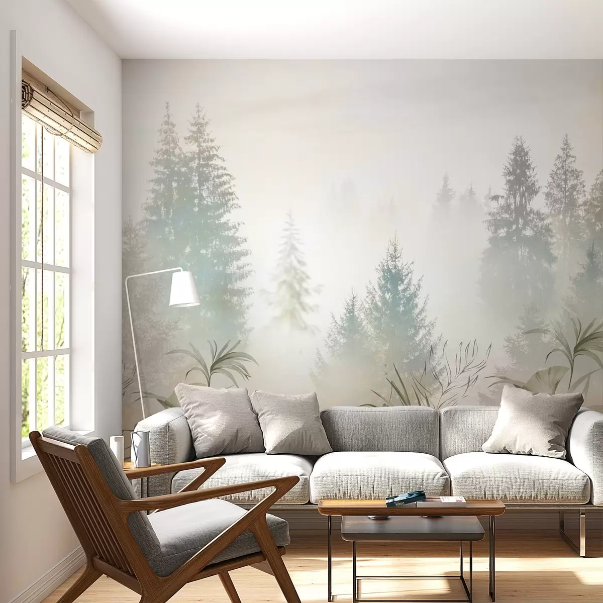 Valokuvatapetti Sumuinen metsä, jossa on herkkiä kasveja Nr u98051