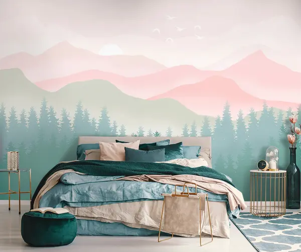Valokuvatapetti Sumuiset vuoret ja mäntymetsä, pehmeät luonnon värit, vaaleanpunainen ja vihreä Nr u98774