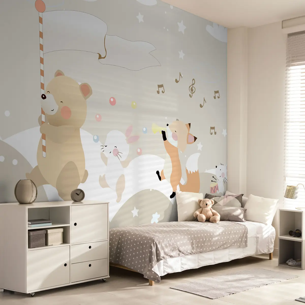 Valokuvatapetti Taustakuva suunnittelu lastenhuoneeseen söpöjä eläimiä vaaleanpunaisissa väreissä Nr u98969