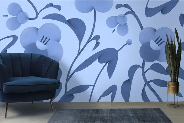 Valokuvatapetti Kasvitieteellinen painatus, jossa on sinisiä koristekukkia Nr u99196v8