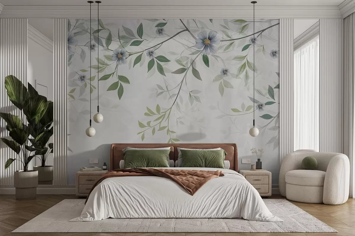 Valokuvatapetti Oksat, joissa on vihreät lehdet ja siniset kukat Nr w00316
