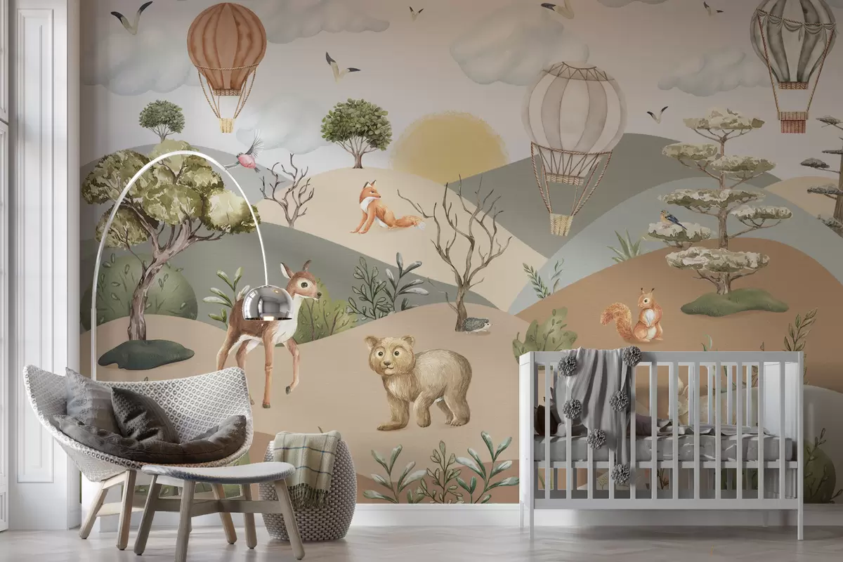 Valokuvatapetti Metsäaukio söpöillä eläimillä ja ilmapalloilla Nr w00636