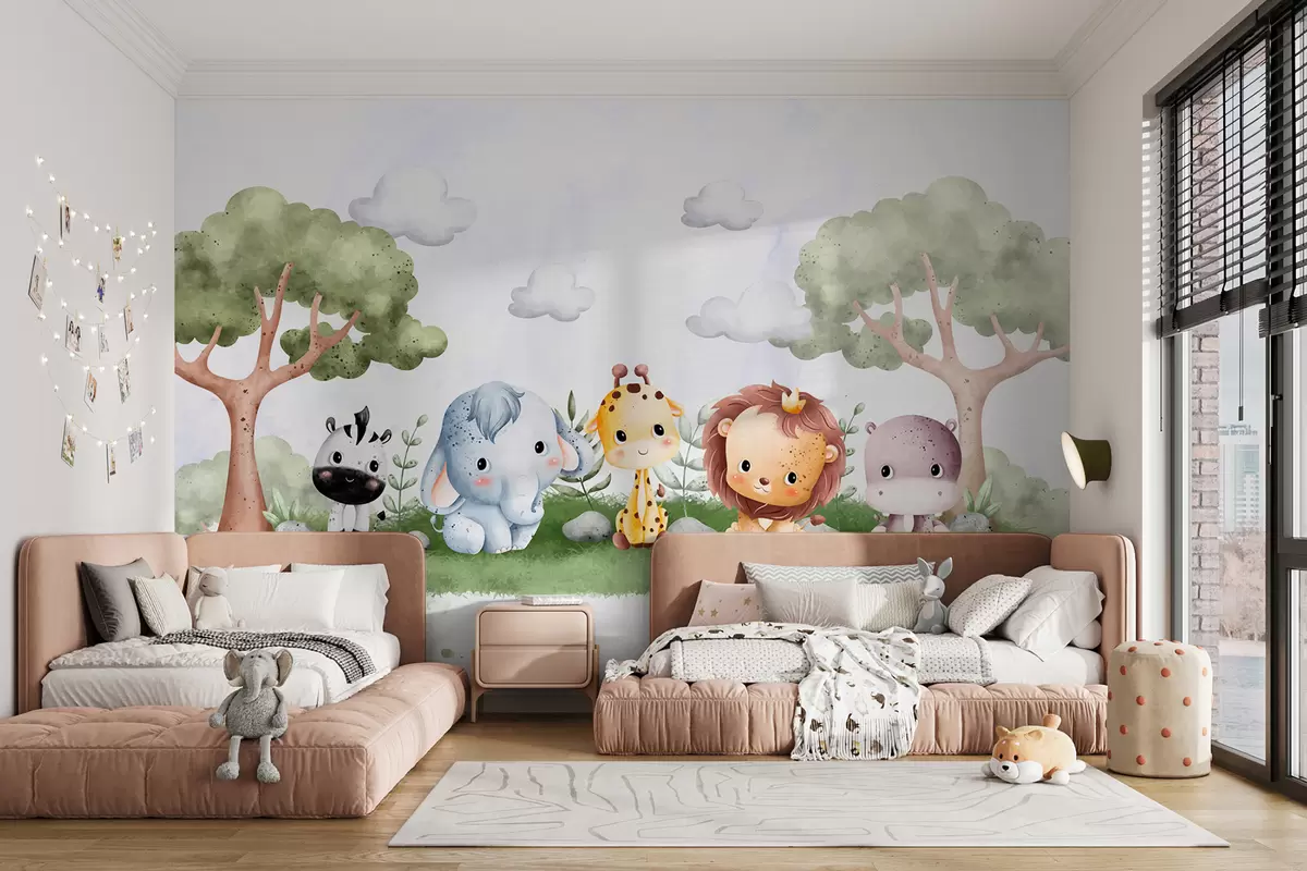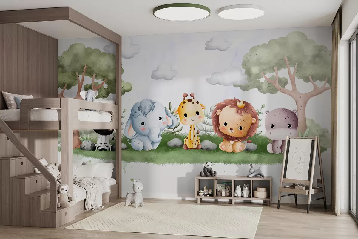 Valokuvatapetti Ryhmä söpöjä sarjakuvaeläimiä istuu nurmikentällä puita ja pilviä taustalla Nr w00705