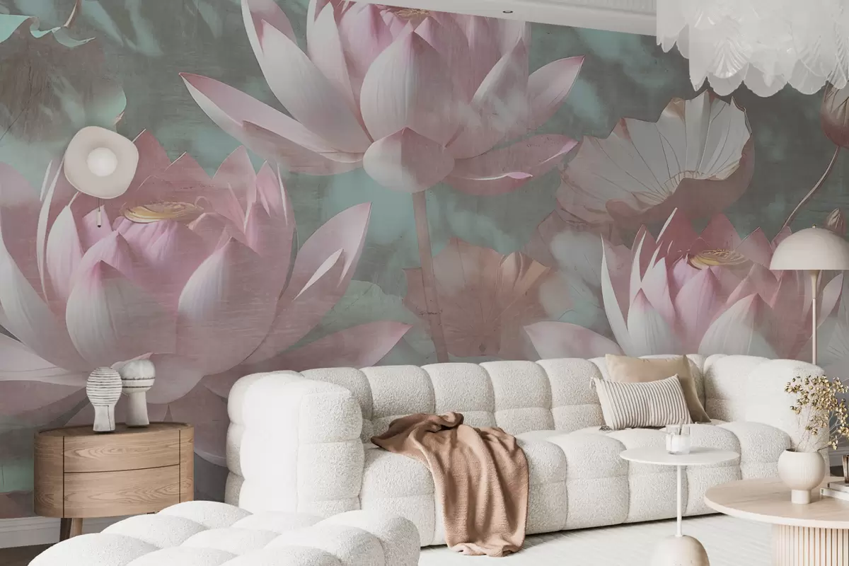 Valokuvatapetti Lähikuva useista herkistä vaaleanpunaisista lootuksenkukista pehmeää, epäselvää taustaa vasten Nr w00710