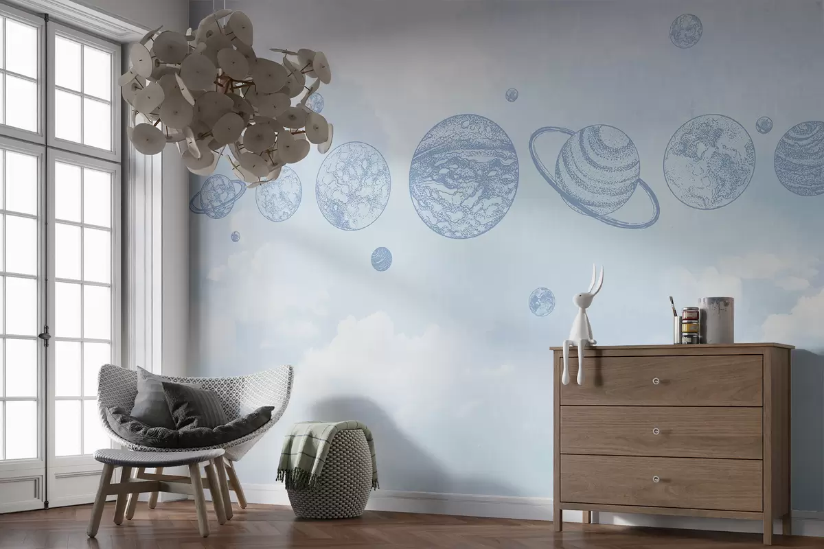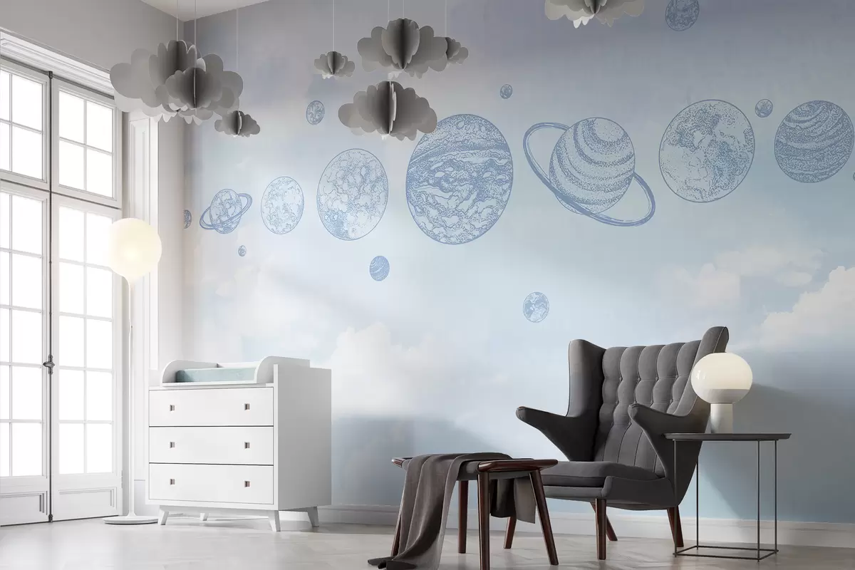 Valokuvatapetti Kelluvat planeetat pilvisellä, pastellinvärisellä eteerisellä taivaalla Nr w00738