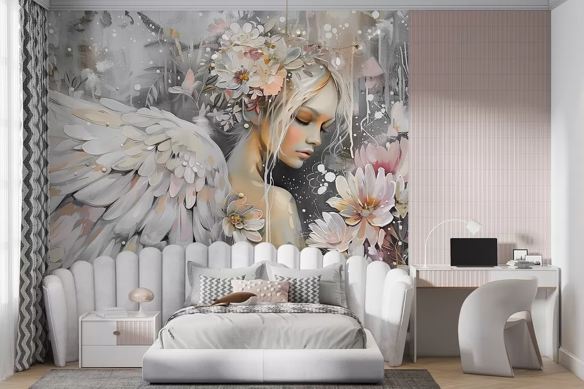 Valokuvatapetti Enkeli tyttö harmaalla pohjalla maalattu öljyllä Nr w00761