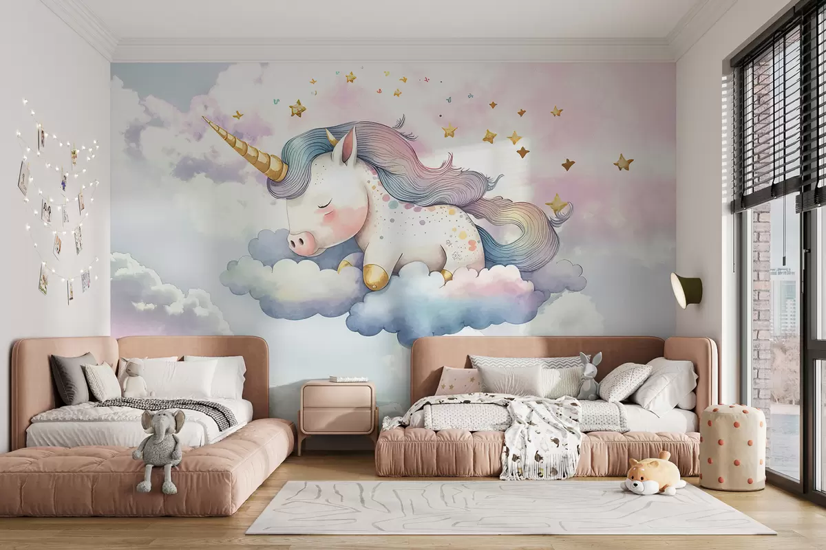 Valokuvatapetti Valkoinen yksisarvinen, jossa on sateenkaariharja ja häntä, lepää pilvessä pastellivärisellä taivaalla tähtien kanssa Nr w00799