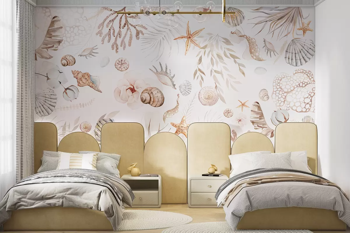 Valokuvatapetti Vesivärinen merikuvio, boho-tyyli, simpukankuoria, korallia, puuvillaa, beigeä Nr w00851