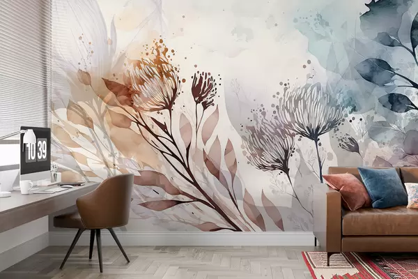 Valokuvatapetti Herkät kukka-abstraktit, tyylitellyt kukat ja kasvimuotoelementit hillityissä, maanläheisissä sävyissä vesiväritaidetta Nr w00898