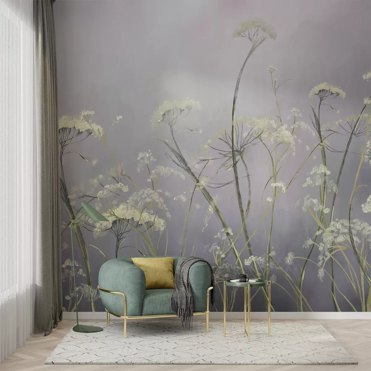 Valokuvatapetti Valkoisia luonnonkukkia sumuisella pellolla pehmeällä, sumealla harmaalla taustalla Nr w00903