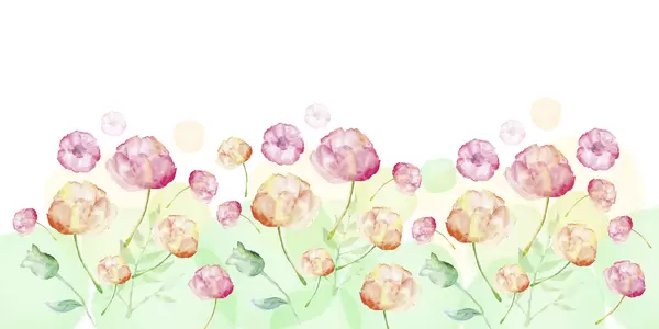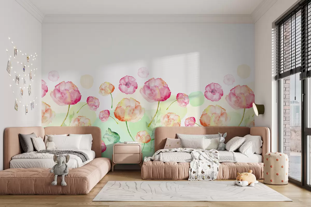 Valokuvatapetti punaoransseja ja vaaleanpunaisia tulppaanit akvarellitekniikalla valkoisella taustalla vihreillä tahroilla Nr w01028