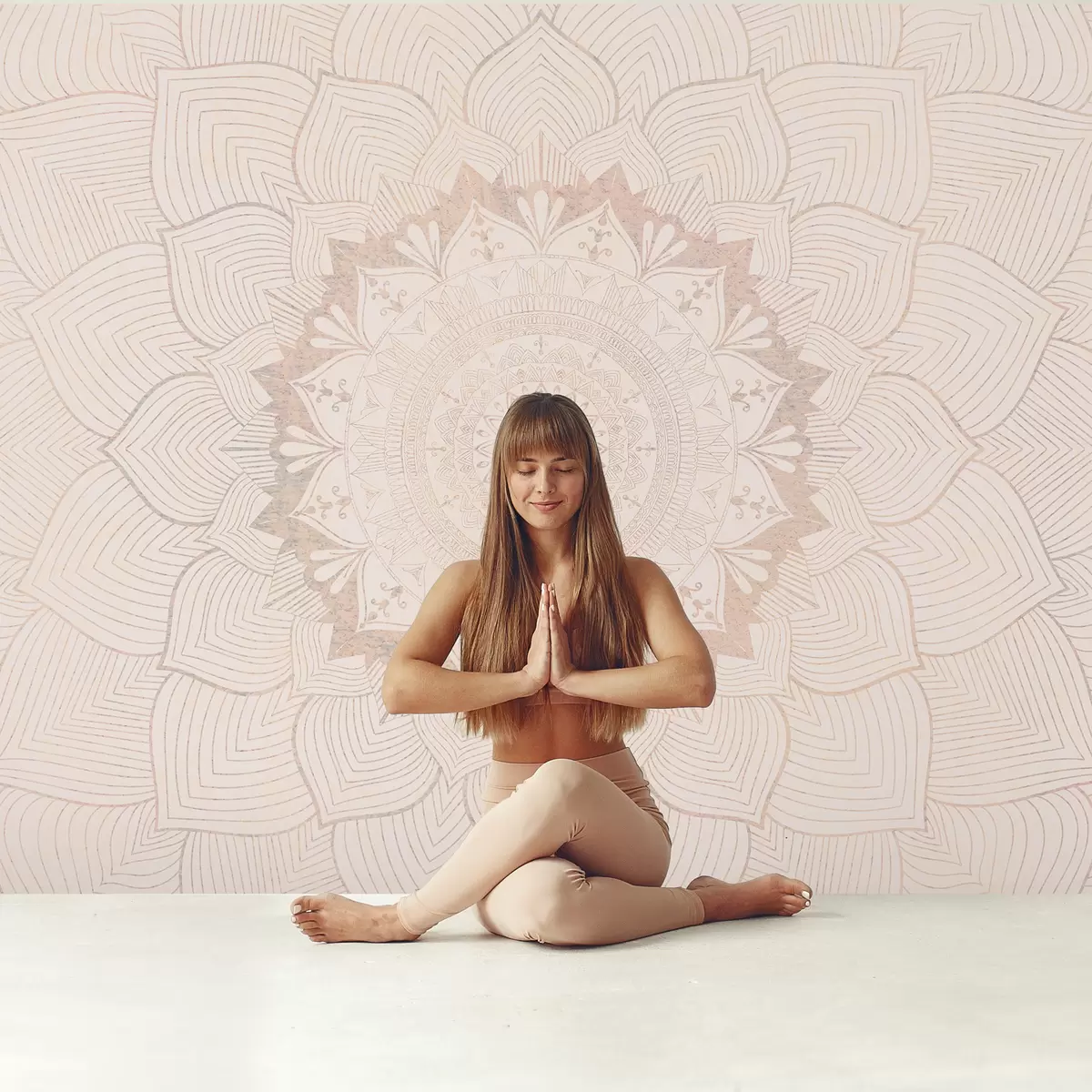 Valokuvatapetti Pyöreä mandala, tapetti joogatilaan tai henkilökohtaisen tilan harmonisoimiseksi. Seinämandala lämpimissä pastellisissa väreissä teksturoidulla epäsäännöllisellä taustalla Nr w01088
