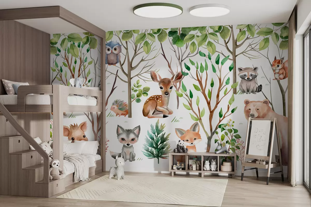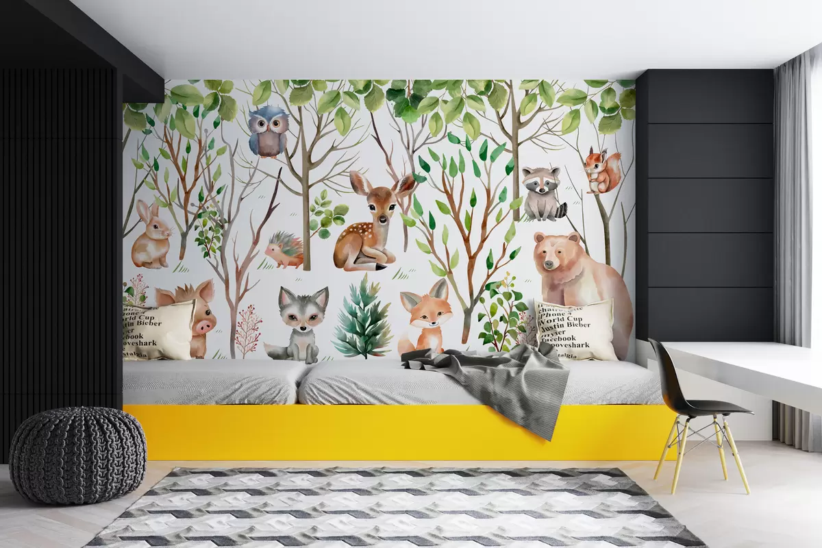 Valokuvatapetti Lasten tapetti metsän eläimet. Värillinen taustakuva valkoisella pohjalla Nr w01127