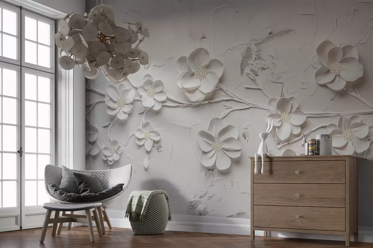 Valokuvatapetti Valkoinen teksturoitu tausta, jossa 3D-valkoiset kukat täydessä kukassa, joita yhdistävät oksat, minimalistinen ja tyylikäs Nr w01226