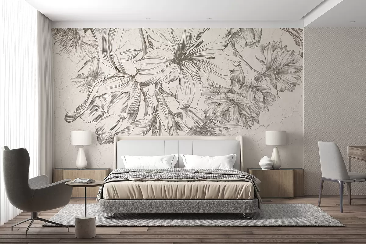 Valokuvatapetti Mustavalkoinen luonnos, jossa piirretään suuria kukkia, graafinen painatus Nr w01253