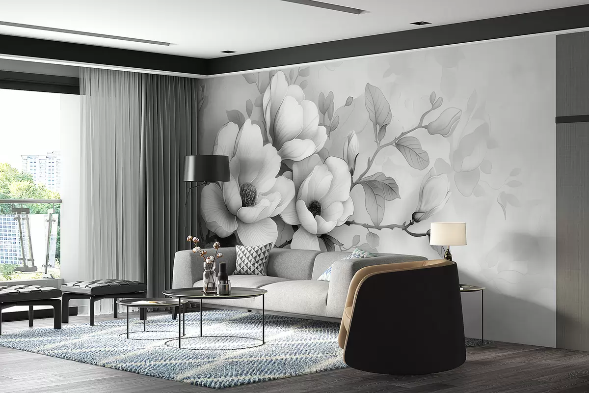 Valokuvatapetti Mustavalkoinen esimerkki magnoliasta harmaalla pohjalla Nr w01277