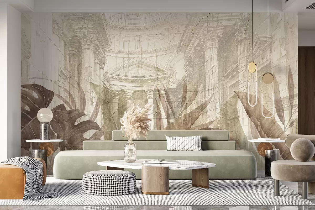 Valokuvatapetti Upea piirustus koristeellisista arkkitehtonisista marmoripylväistä ja rehevistä trooppisista seepiakasveista Nr w01311v1