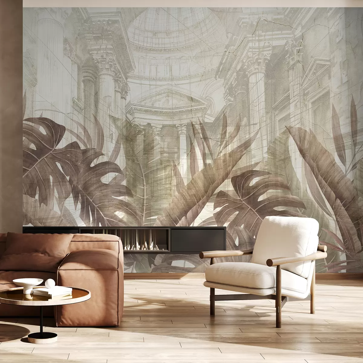 Valokuvatapetti Upea piirustus koristeellisista arkkitehtonisista marmoripylväistä ja rehevistä trooppisista seepiakasveista Nr w01311v1