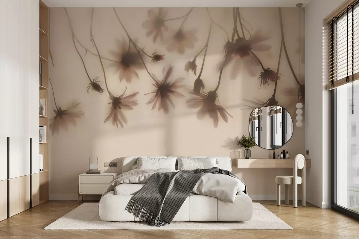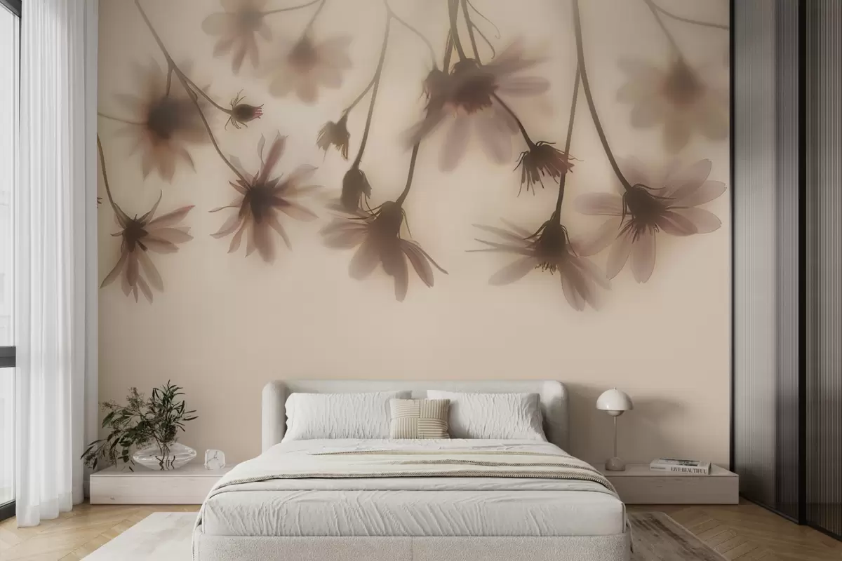Valokuvatapetti Herkät kukat ylhäältä riippuvassa sumussa vaaleanpunaisissa väreissä Nr w01469