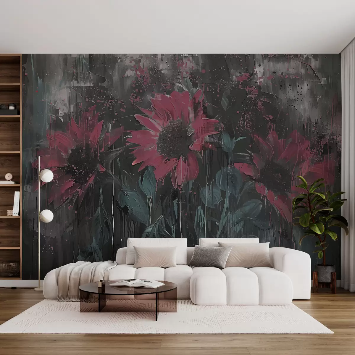 Valokuvatapetti Abstrakti auringonkukkakuva, tummanharmaa tausta ja puna-vaaleanpunaiset sävyt Nr w01480v1