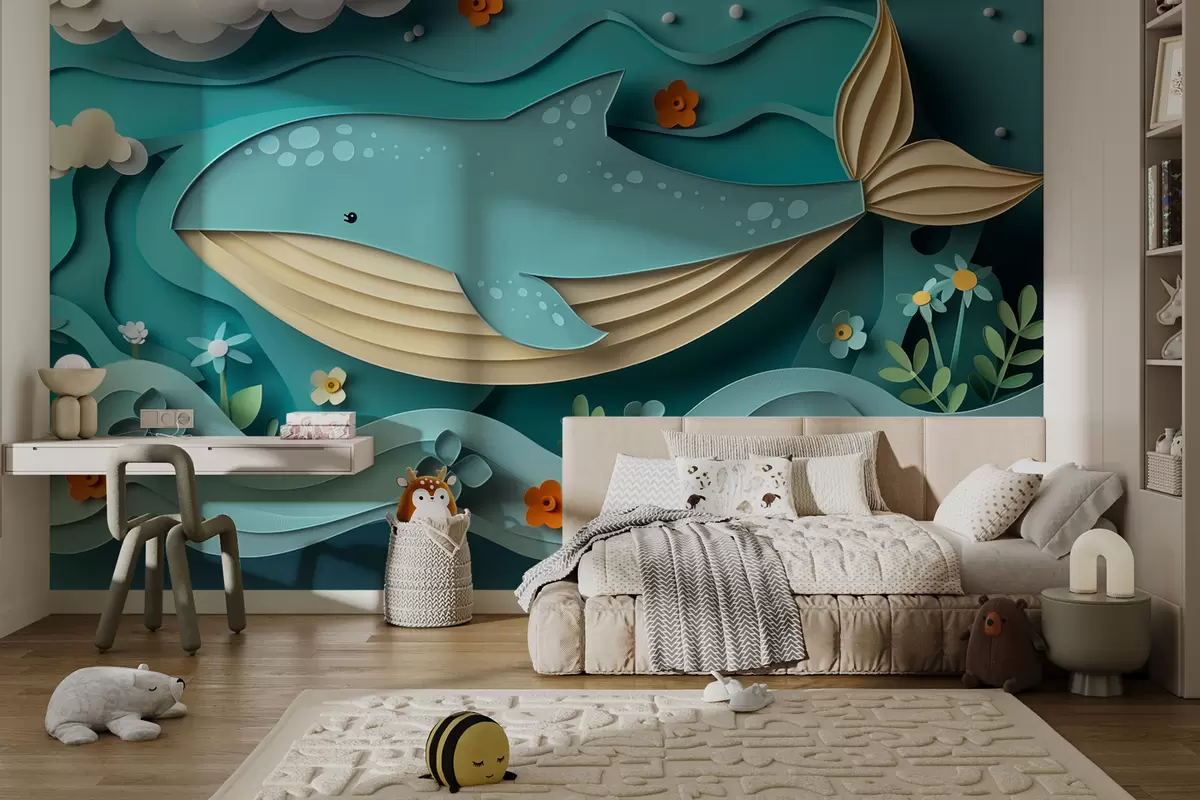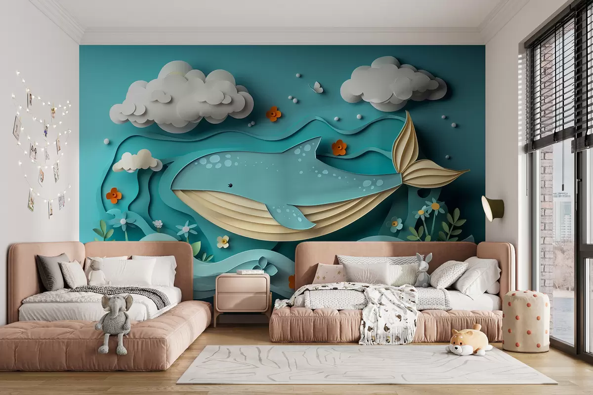 Valokuvatapetti Leikkisä valas pilvissä paperileikkauksella, 3D-tehoste Nr w01496