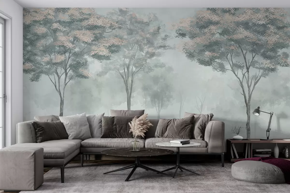 Valokuvatapetti Sumuinen metsän siluetti vihreällä, vaaleanharmaalla ja beigen värillä Nr w01599