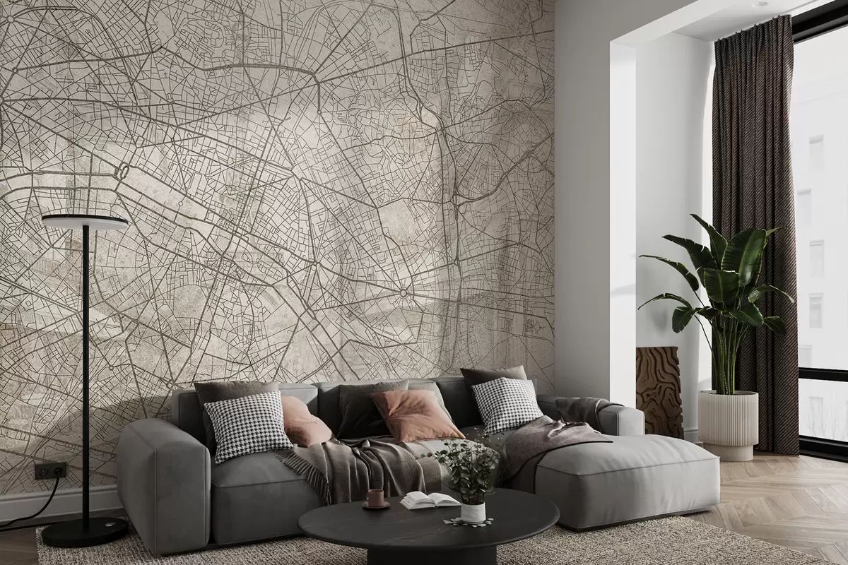 Valokuvatapetti Pariisin kaupungin kartta, viivapiirros, arkkitehtuuri, Ranska, beige värit Nr w01697