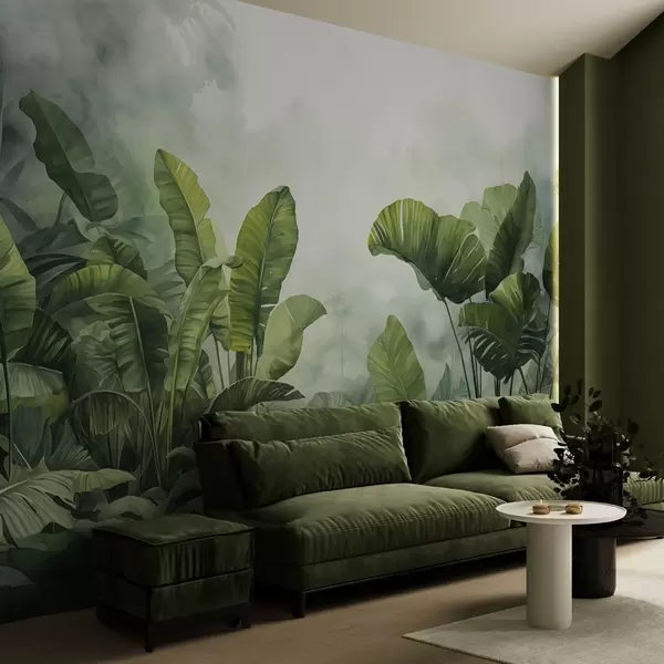 Valokuvatapetti Trooppiset lehdet viidakossa sumun taustalla märkä akvarelliväriä Nr w01868