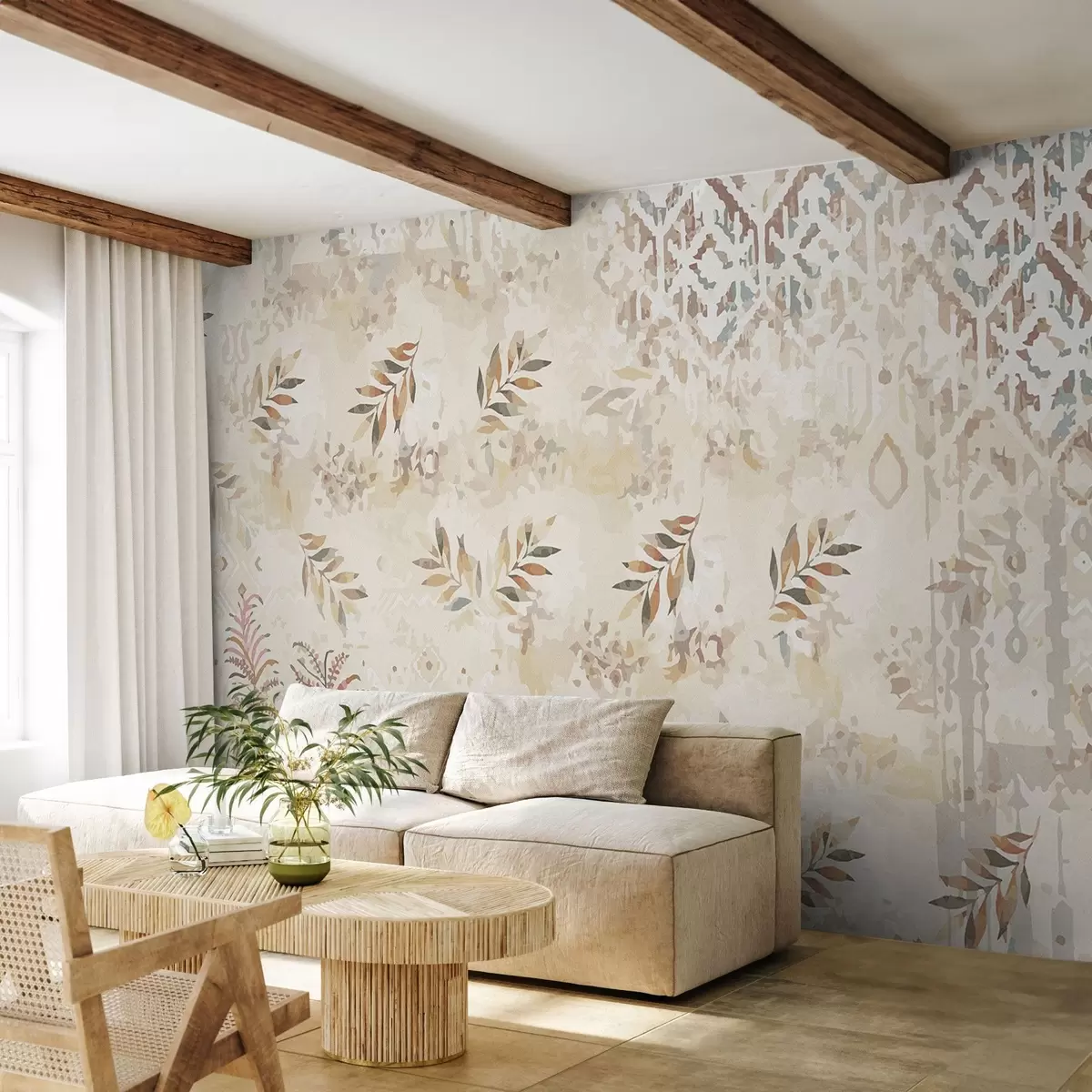 Valokuvatapetti retro-tyylinen tapetti, jossa on kuvioita, hankauselementtejä, tahroja ja lehtiä, beigeissä väreissä Nr w01955
