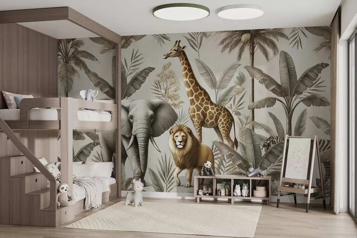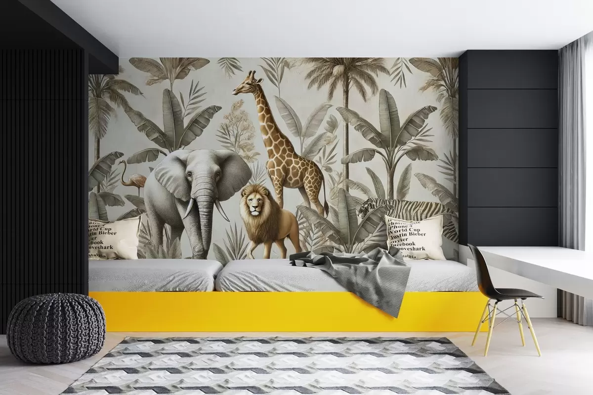 Valokuvatapetti Safari lasten taustakuva trooppinen maisema ja erilaisia eläimiä tyylikkäissä väreissä Nr w01956