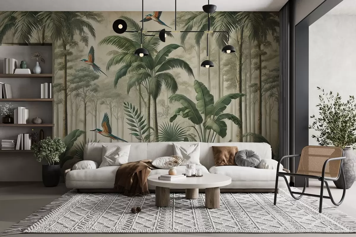 Valokuvatapetti Panoraama, jossa on trooppinen maisema ja lintuja w01957